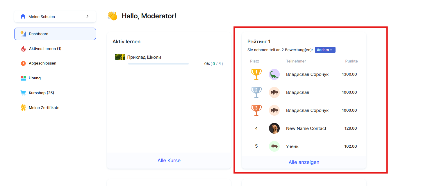 Der Name der Rangliste wird den Teilnehmern in ihrem Dashboard als Überschrift des Blocks angezeigt. Wählen Sie Namen, die den Inhalt des Wettbewerbs widerspiegeln. Wenn ein Teilnehmer an mehreren Ranglisten gleichzeitig teilnimmt, kann er über die Schaltfläche Ändern zwischen ihnen wechseln, um verschiedene Teamranglisten anzuzeigen.