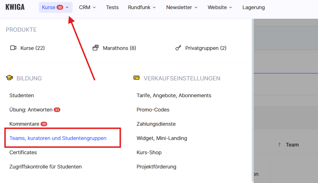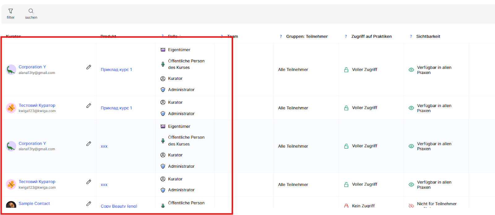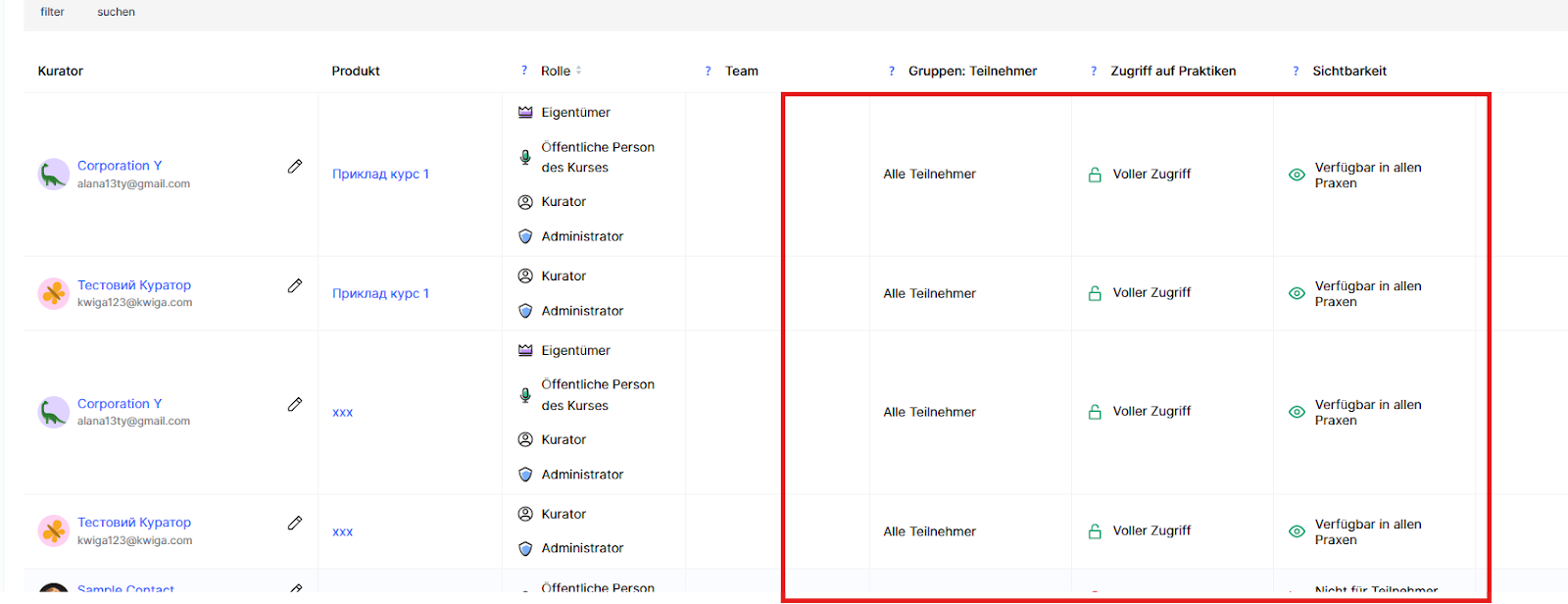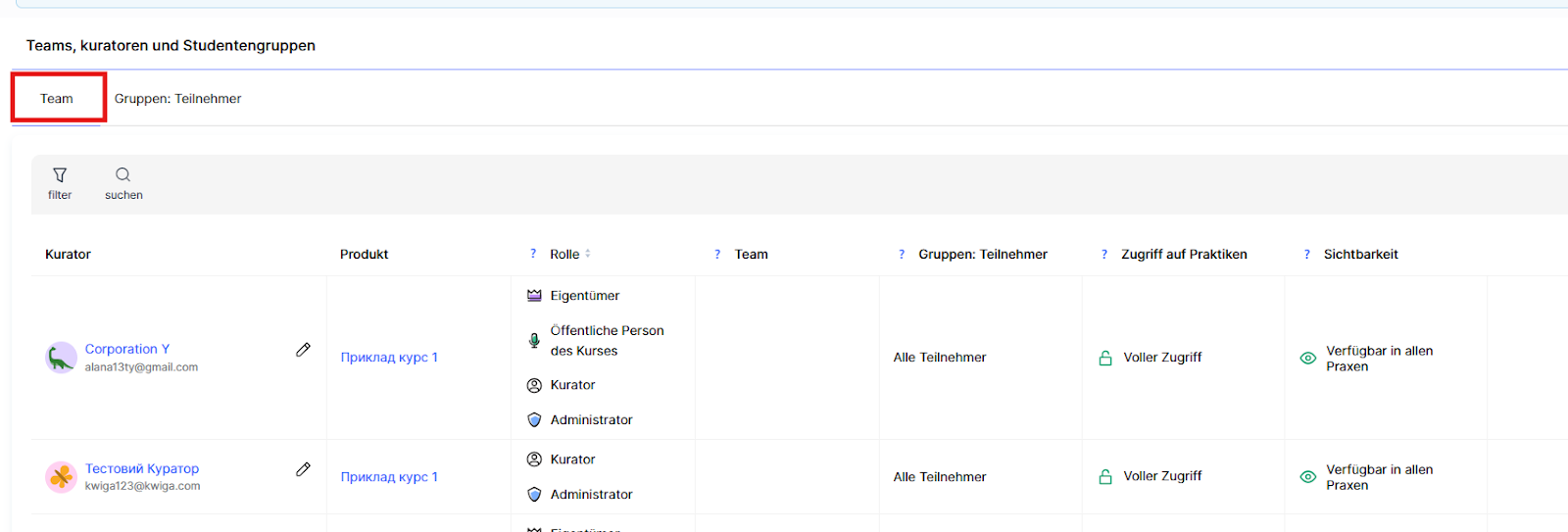 Eine ordentliche Organisation des Projektteams und die Verwaltung von Teilnehmergruppen vereinfachen den Bildungsprozess erheblich und helfen, eine effektive Kommunikation aufzubauen. In Kwiga gibt es einen speziellen Bereich, in dem Sie Assistenten, ihre Rollen, Teams und den Studentenzugriff verwalten können.