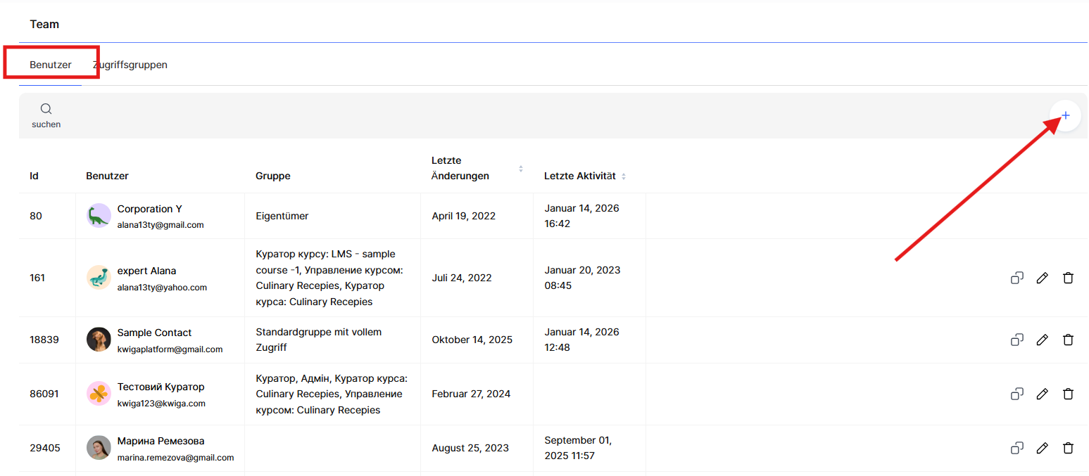 Wenn Sie einem bestimmten Benutzer Zugriff auf einen bestimmten Kurs gewähren müssen, empfehlen wir, dies über das Menü Kurse → Team, Kuratoren und Studentengruppen zu konfigurieren.