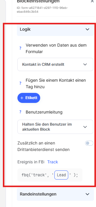Um zu konfigurieren, wie die Formulardaten für die Kontaktdatenerfassung genutzt werden, wähle das Formular im zentralen Bereich des Editors aus und gehe im linken Panel zum Abschnitt Logik.