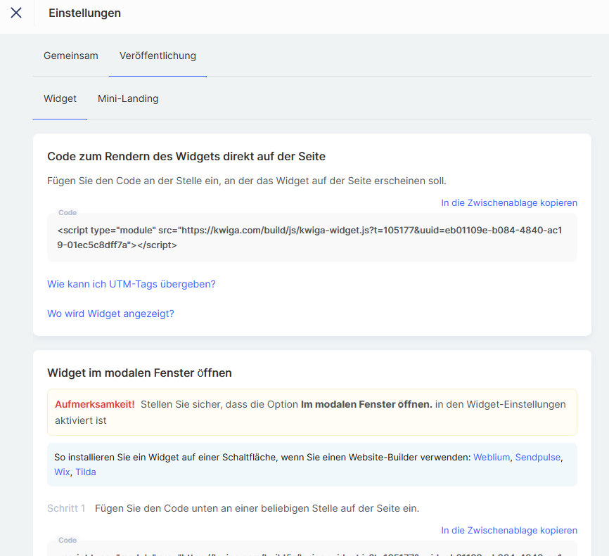 In der Registerkarte Veröffentlichung kannst du den Widget-Code kopieren, um ihn direkt in deine Seite einzubetten.