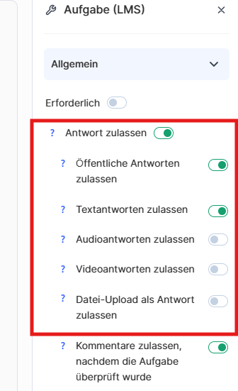Antwort zulassen – wenn diese Option aktiviert ist, kann der/die Studierende eine Antwort in jedem Format einreichen. Ist sie deaktiviert, wird die Aufgabe rein theoretisch oder informativ, und der/die Studierende hat kein Antwortfeld.