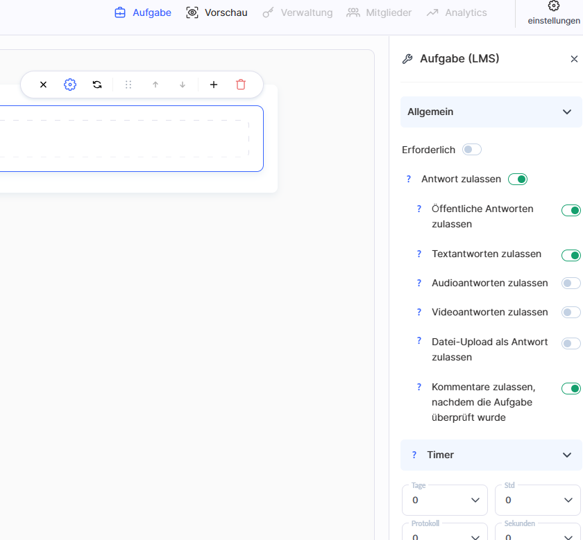 Flexible Einstellungen helfen dabei, die Aufgaben an die Bedürfnisse des Kurses anzupassen. Sie können einen Timer festlegen, die Bewertung konfigurieren, Kommentare nach der Überprüfung erlauben und Benachrichtigungen über neue Antworten aktivieren. Dies macht den Überprüfungsprozess effizienter und sorgt für besseres Feedback zwischen Lehrenden und Studierenden.