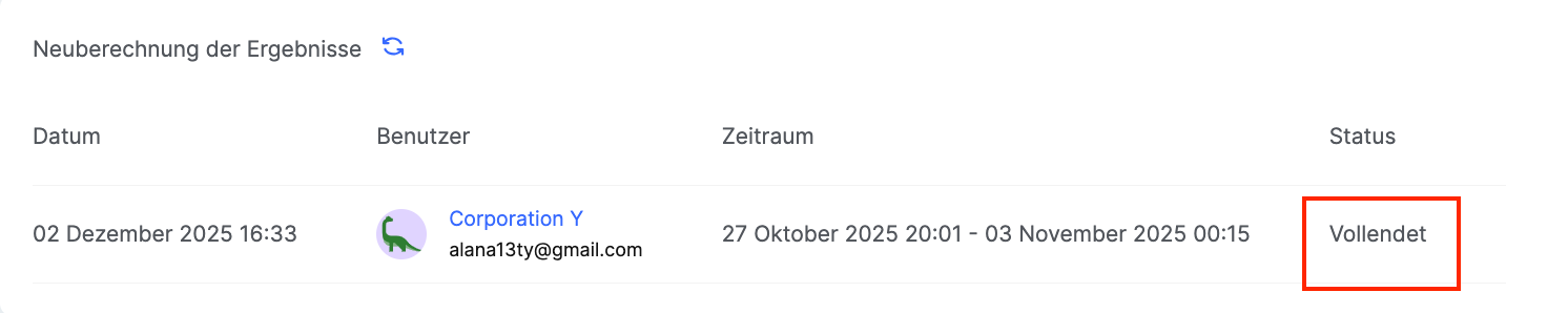 Nach der Neuberechnung ändert sich der Status zu „Abgeschlossen“ und folgende Elemente können aktualisiert werden: