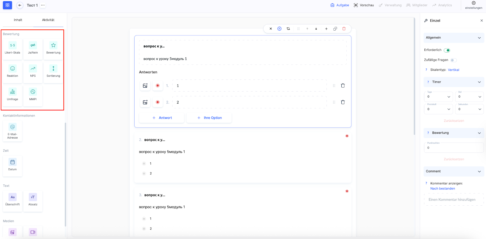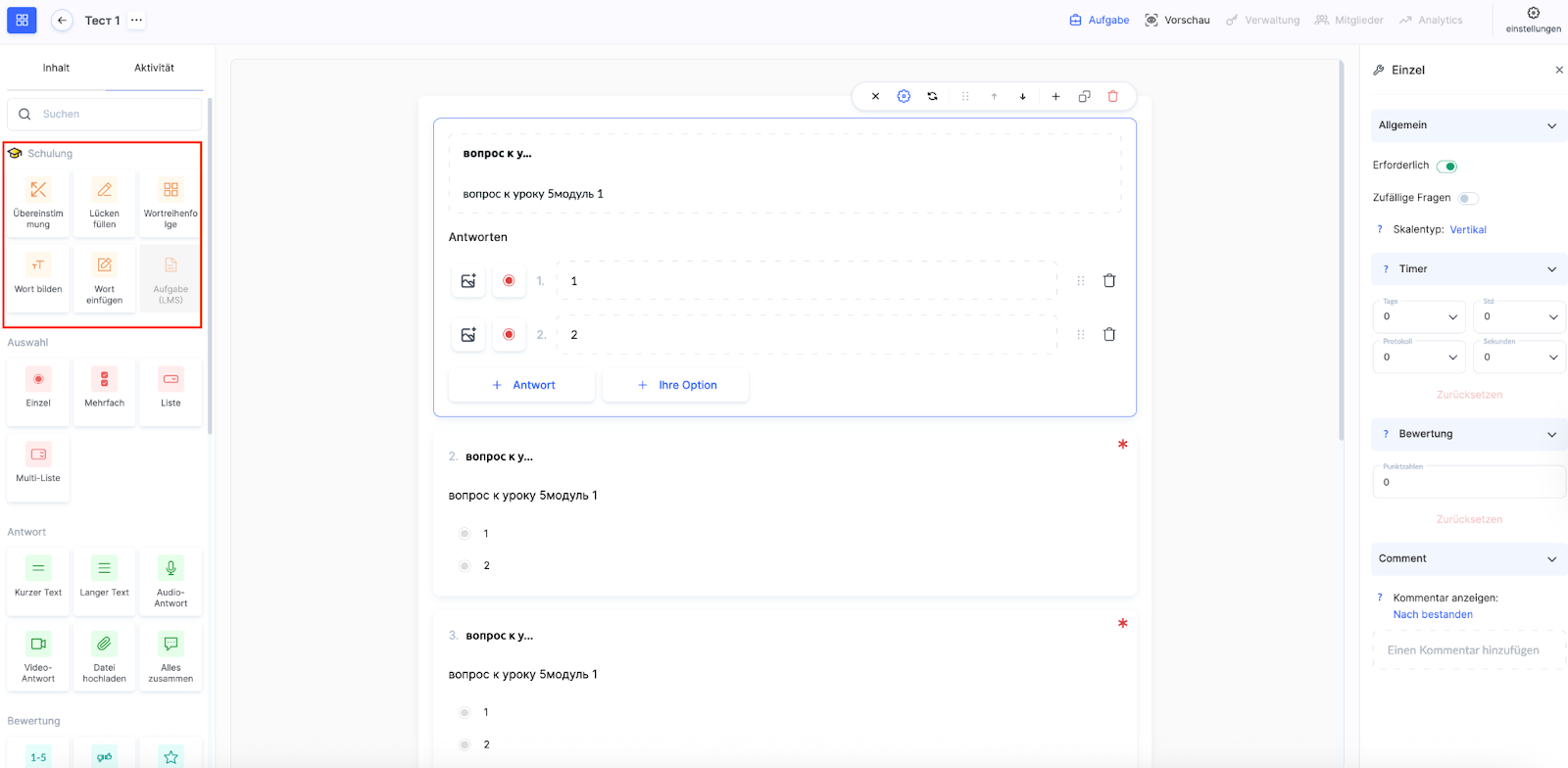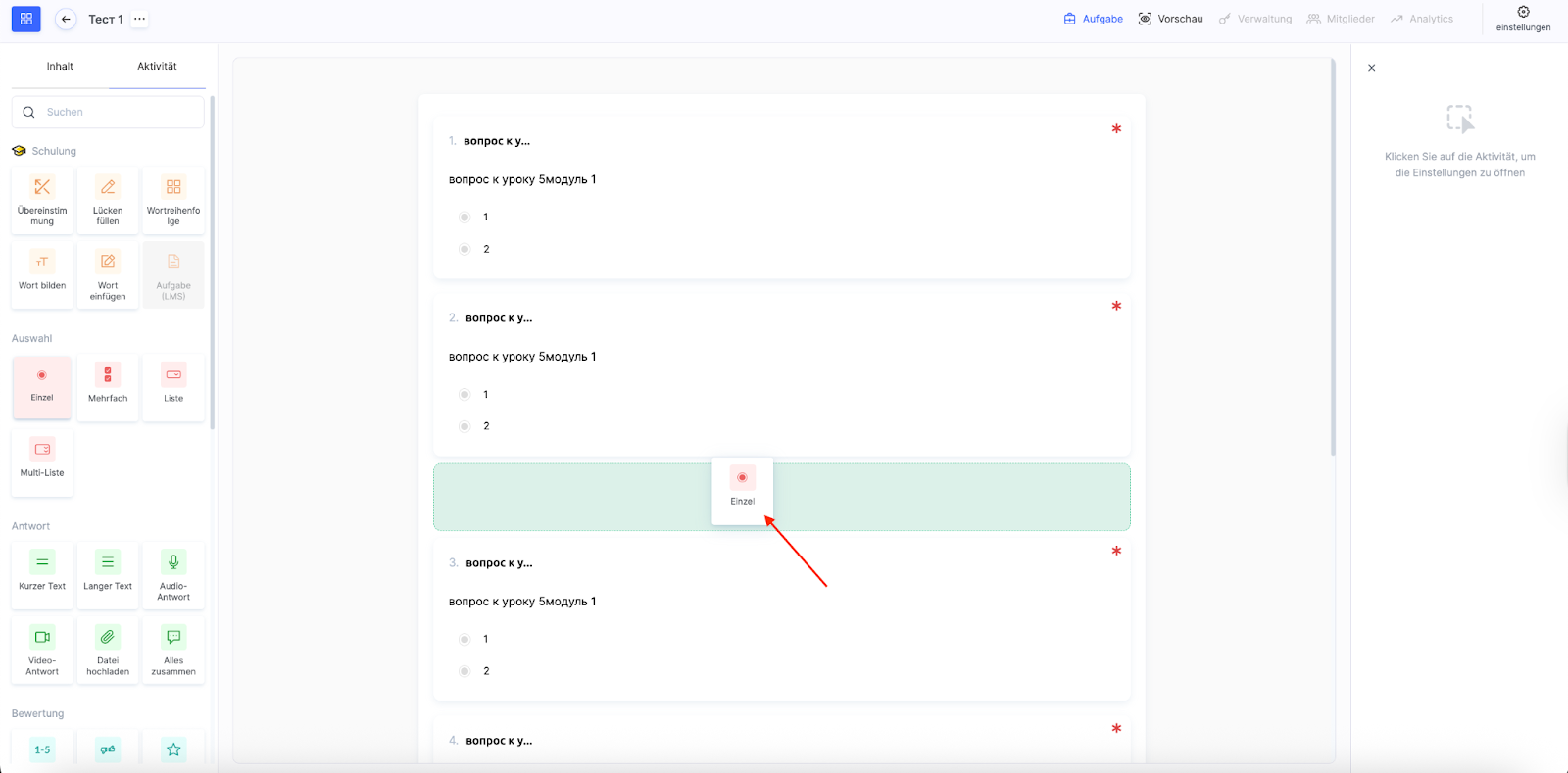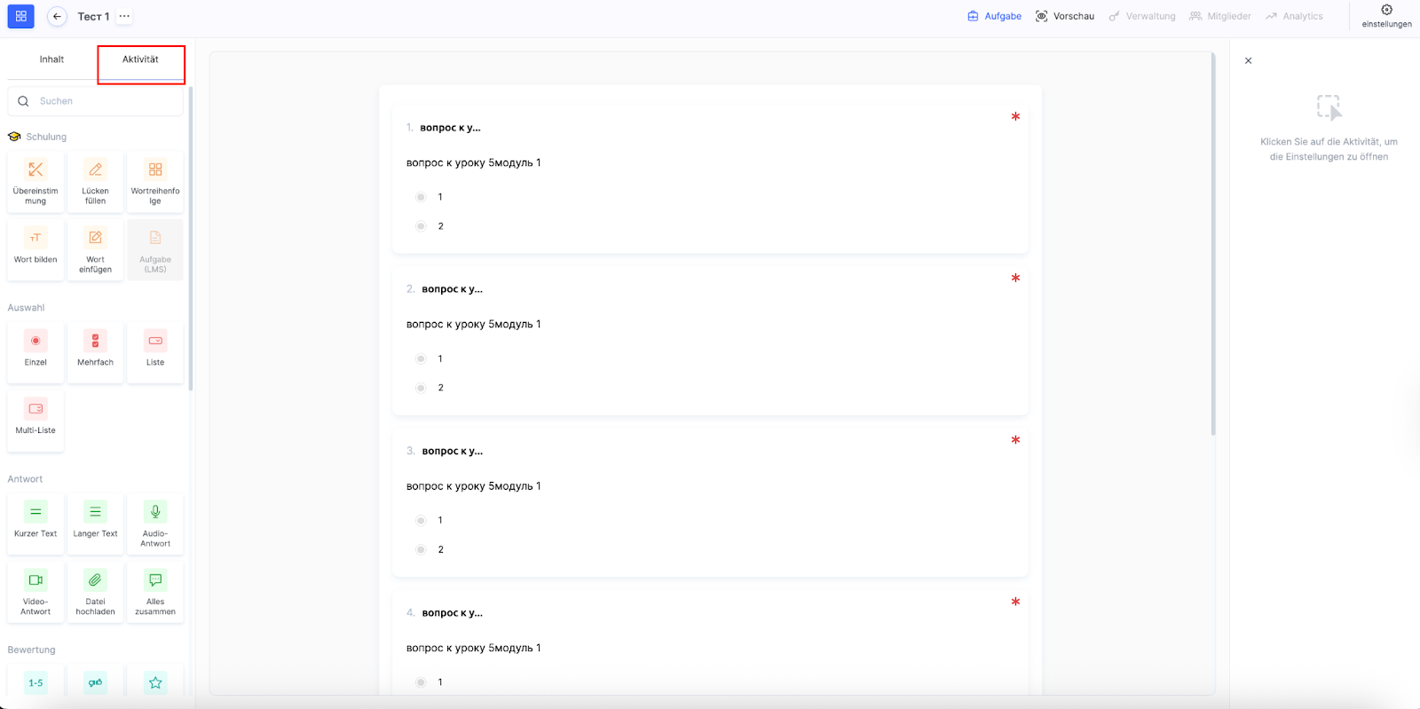 Füllen und konfigurieren Sie die ausgewählte Aktivität – zum Beispiel, indem Sie Fragen und Antwortoptionen hinzufügen.