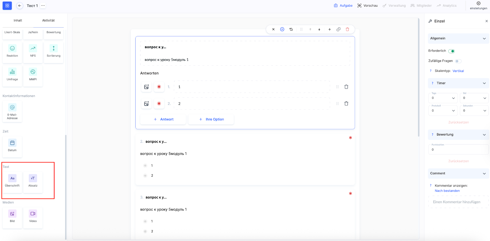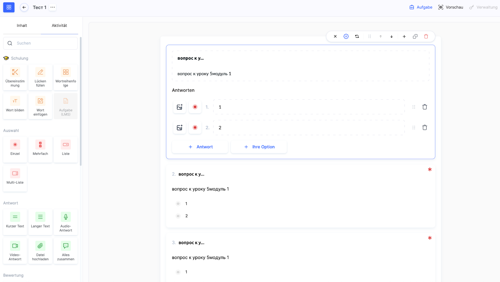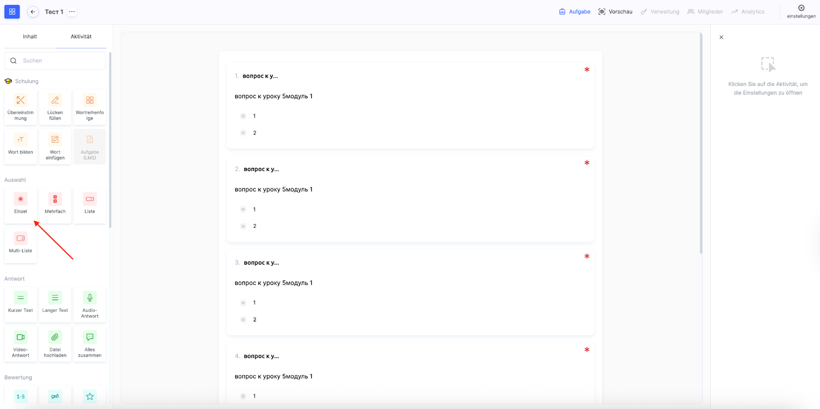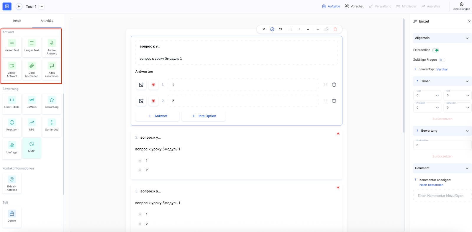 Füllen und konfigurieren Sie die ausgewählte Aktivität – zum Beispiel, indem Sie Fragen und Antwortoptionen hinzufügen.