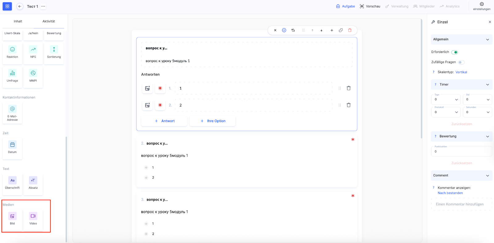 Möglichkeit, Bilder und Videos direkt zum Fragebogen hinzuzufügen. Diese werden verwendet, um Fragen zu veranschaulichen, visuelle Aufgaben zu erstellen oder Lehrmaterialien hinzuzufügen.