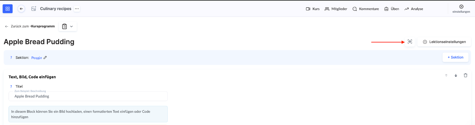 Alternativ kannst du beim Bearbeiten einer einzelnen Lektion auf das Augensymbol neben der Schaltfläche Lektionseinstellungen klicken.