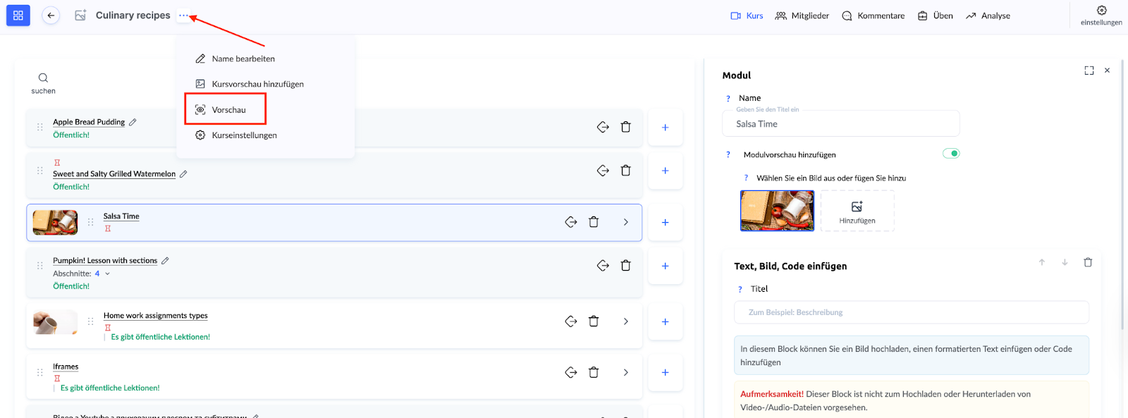 Um zu sehen, wie der Kurs für verschiedene Benutzer aussieht, klicke auf die drei Punkte neben dem Kurstitel oben und wähle anschließend die Schaltfläche Vorschau.