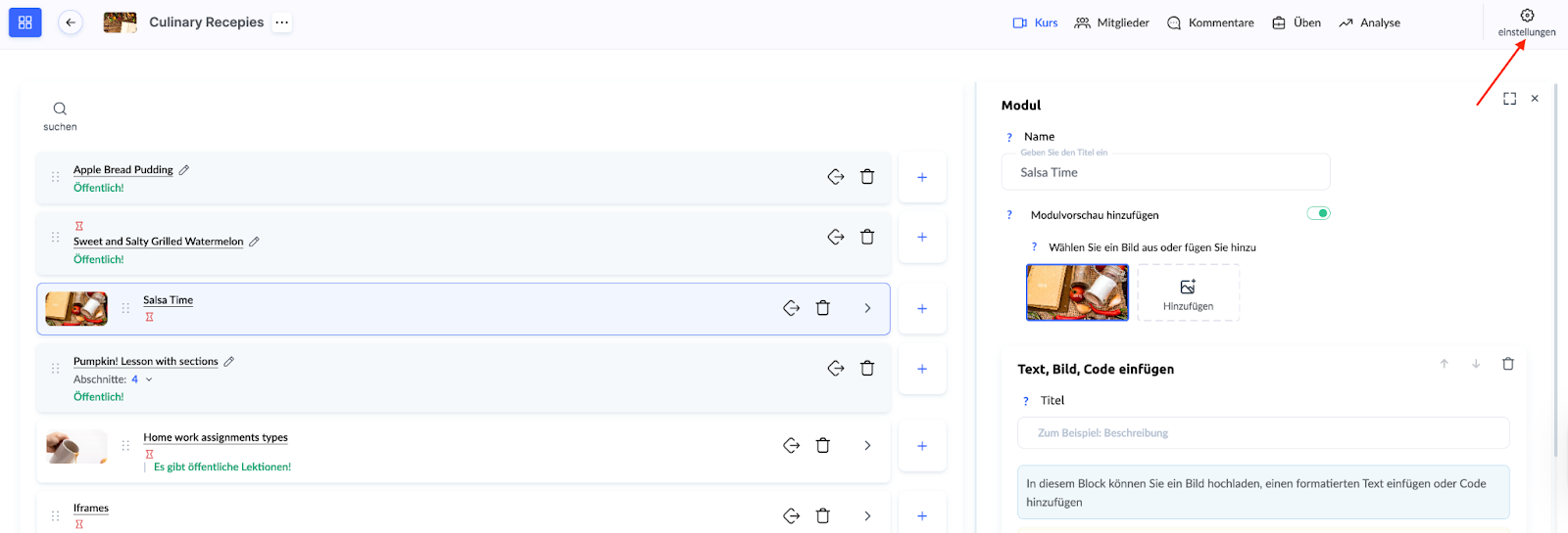Um Verzögerungen einzustellen, gehe zu den Kurseinstellungen oder verlasse den Lektionen-Editor. Öffne Einstellungen