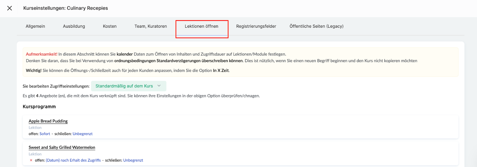 Hinweis: Wenn der Kurszugang auf einen bestimmten Zeitraum beschränkt ist (z. B. zwei Monate), empfiehlt es sich, die Schließungen über Angebote zu steuern, anstatt für jede Lektion oder jedes Modul ein Schließdatum festzulegen. Diese Vorgehensweise erleichtert die Verlängerung des Zugangs für Teilnehmende.