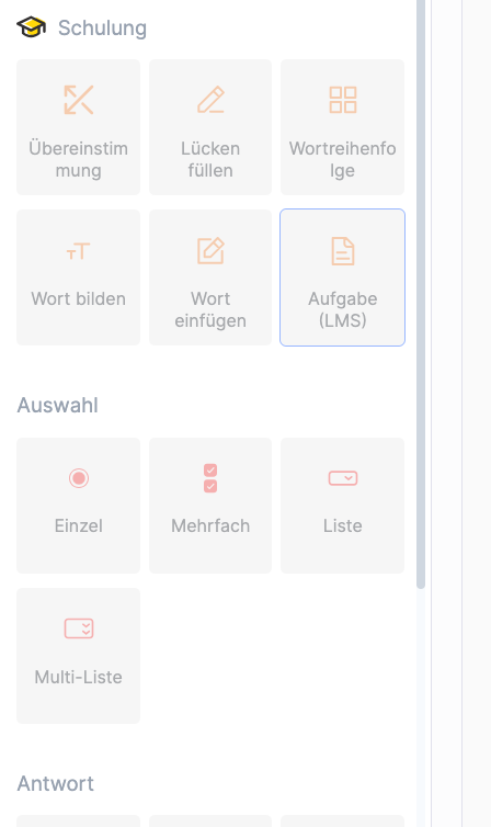 Im linken Panel findest du alle verfügbaren Fragetypen, nach Kategorien sortiert, damit du sie leicht finden kannst.