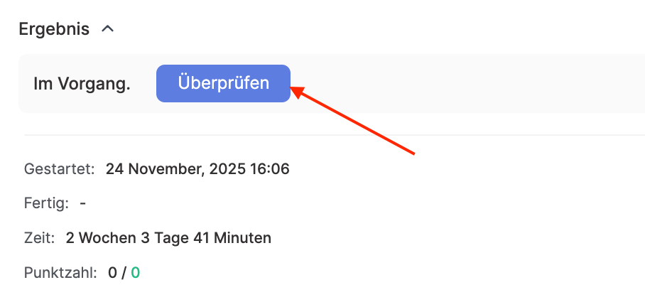 Wichtig: Die Überprüfung von Aufgaben ist nur im Tutor-Bereich verfügbar, nicht im Lernenden-Bereich. Der Tutor muss sicherstellen, dass er im entsprechenden Projekt als Tutor (oder Administrator) angemeldet ist — und nicht als Lernender.
