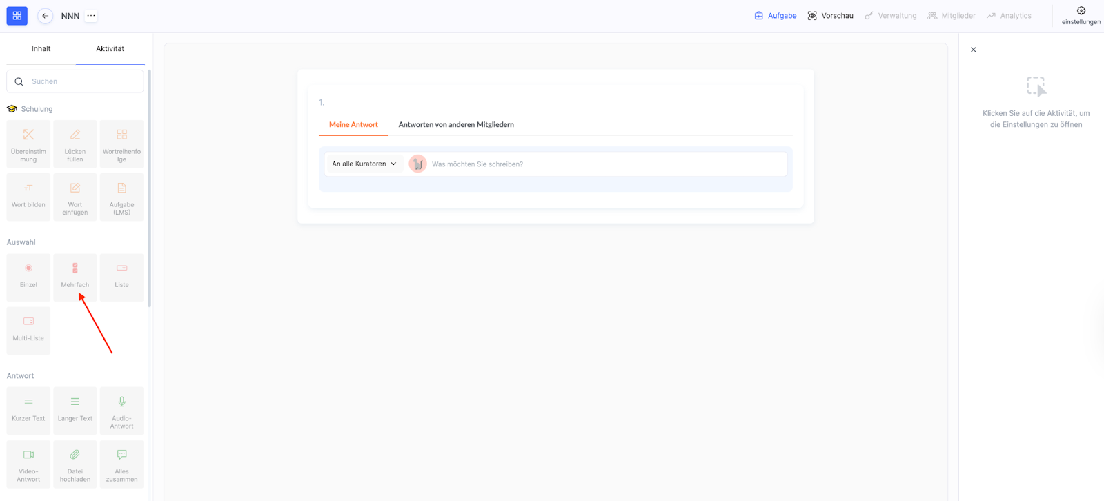 Um eine weitere Aktivität (Frage) hinzuzufügen, klicke oben über der Frage auf +