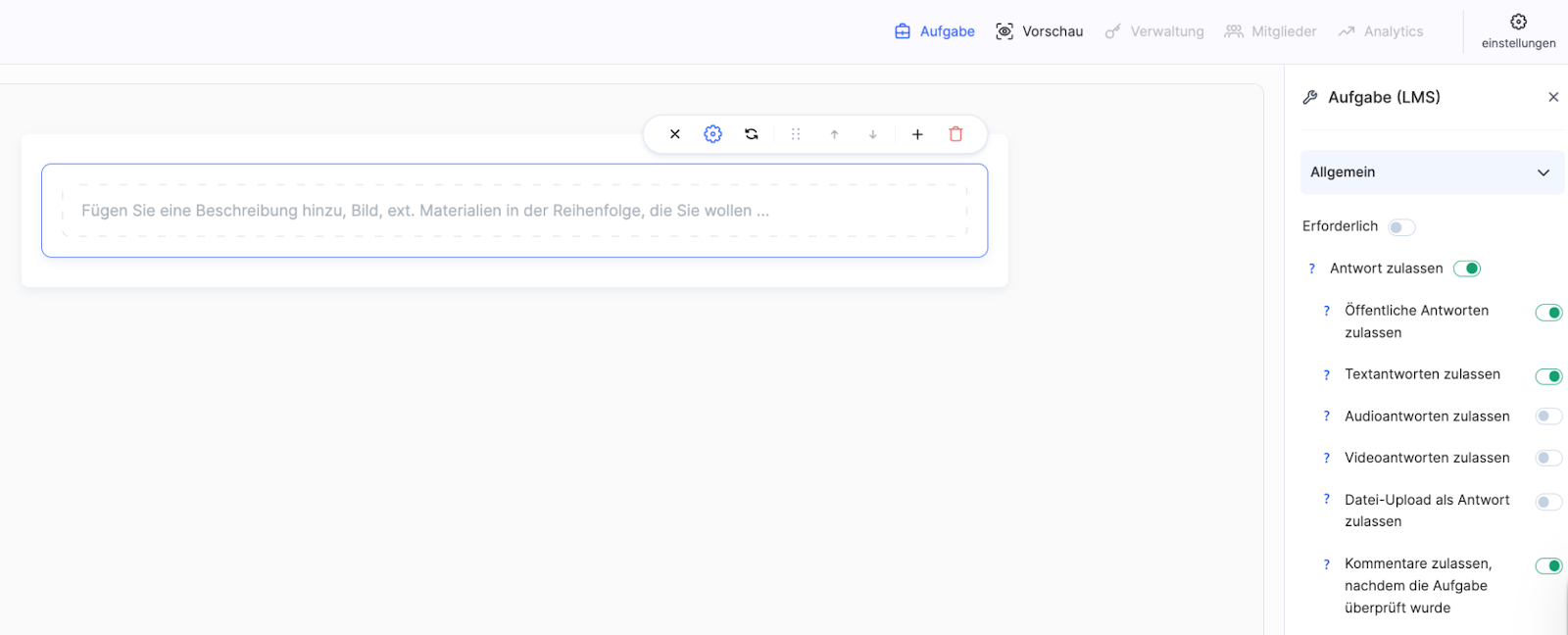 Empfehlung: Beim Fragetyp Aufgabe (LMS) ist das Hinzufügen weiterer Fragen nicht möglich. Verwende ihn, wenn eine ausführliche Antwort erwartet wird oder wenn die Lernenden später auf Tutor-Kommentare reagieren sollen.