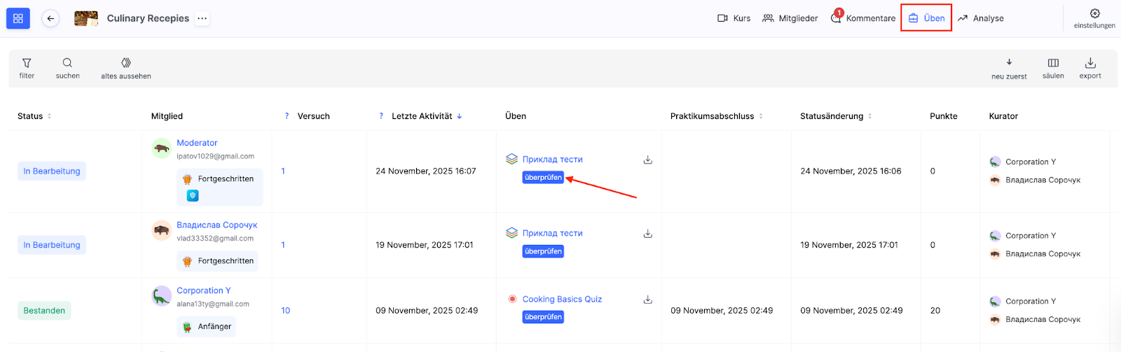 Sobald ein Lernender die Aufgabe abgeschlossen hat, wird sie im Menü Üben des Kurses zur Überprüfung verfügbar.