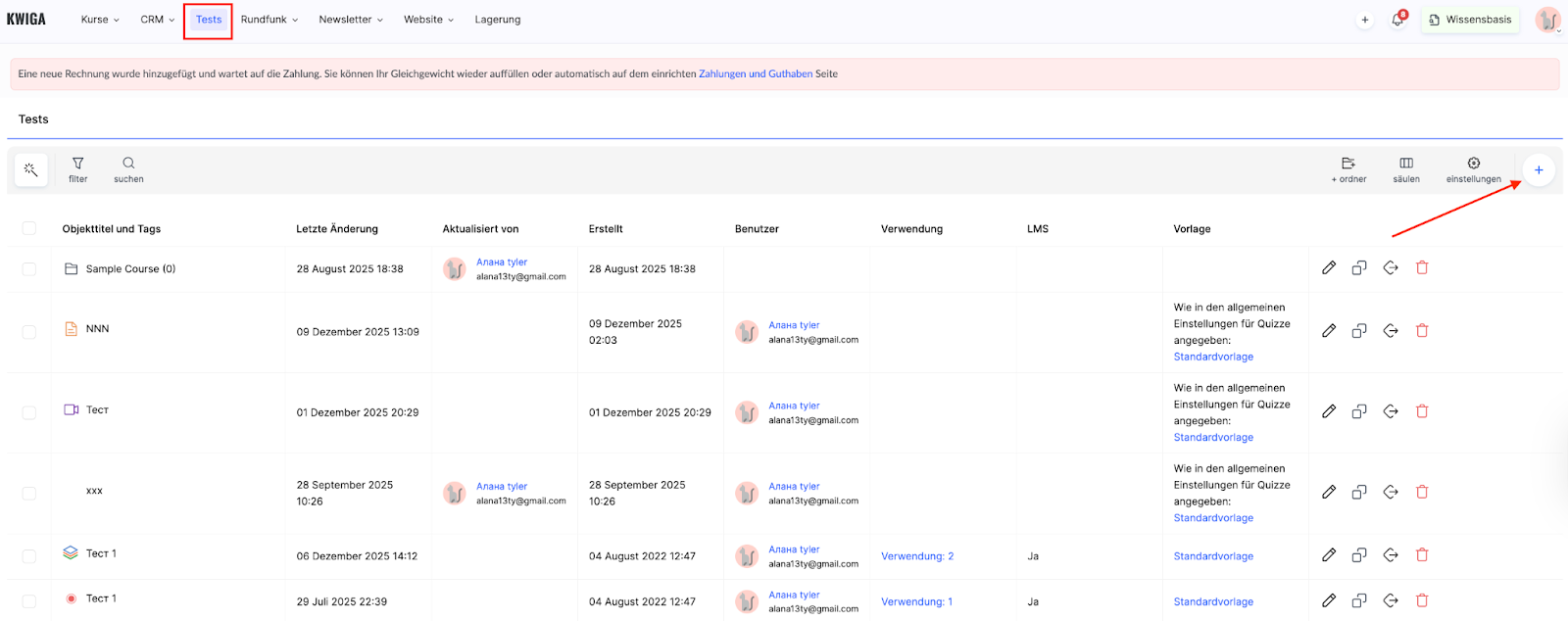Zunächst musst du eine Aufgabe erstellen, die später im Kurs verwendet wird. Aufgaben werden getrennt vom Kurs erstellt. Gehe zum Bereich Quizze und erstelle eine neue Aufgabe.