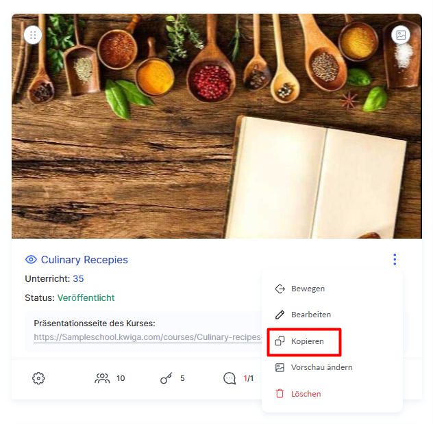 Wenn du den Kurs kopieren möchtest, um ihn einer neuen Teilnehmergruppe zur Verfügung zu stellen oder einen anderen Preis festzulegen, ist es besser, Angebote zu verwenden.