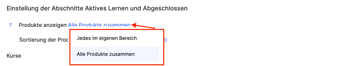 Alle Produkte zusammen – alle Lernprodukte werden in einem einzigen Bereich angezeigt, unabhängig vom Typ, ohne separate Registerkarten. Bei dieser Option steht eine zusätzliche Sortierungseinstellung zur Verfügung.