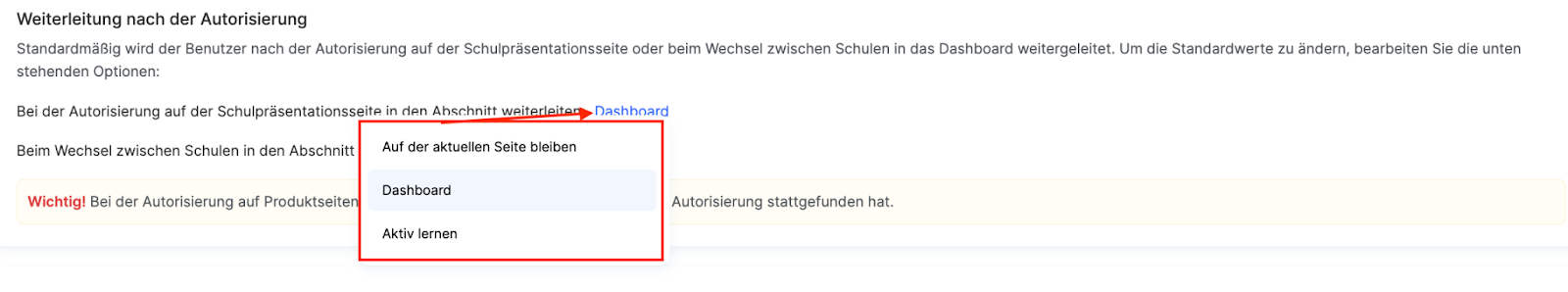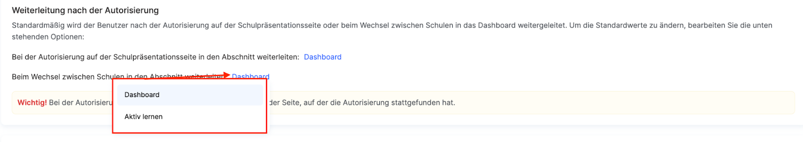 Wenn ein Teilnehmer zwischen verschiedenen Schulen im System wechselt, kann die Weiterleitung entweder auf das Dashboard oder direkt zu „Aktiv Lernen“ eingestellt werden.