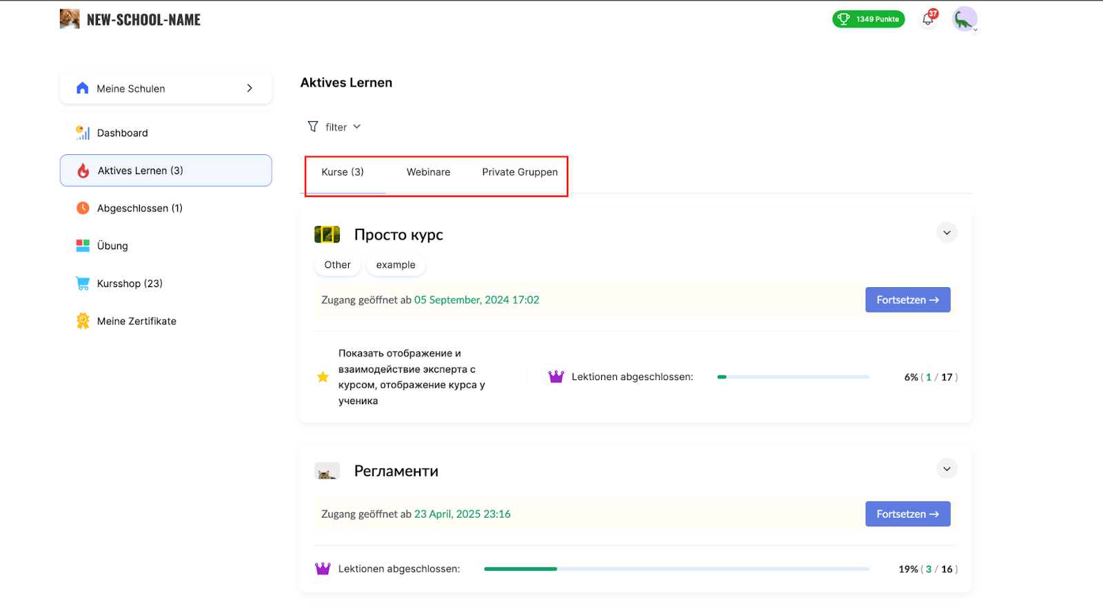 Im Studentenprofil gibt es drei Arten von Lernprodukten: Kurse (Marathons), Webinare und Private Gruppen.