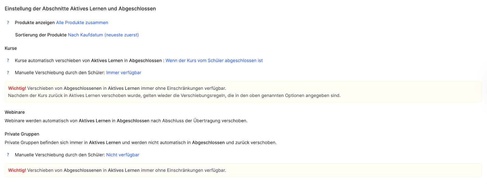 2. Einstellungen für die Bereiche „Aktiv Lernen“ und „Abgeschlossen“