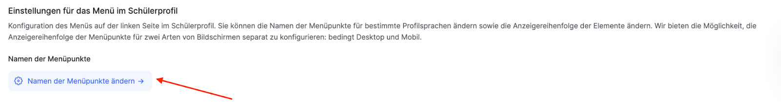 Um Menüpunkte umzubenennen, verwenden Sie die Schaltfläche Menüpunkte umbenennen. Hier können Sie die Bezeichnungen für jede Sprachversion der Website individuell anpassen. Zum Beispiel können Sie statt des Standardnamens „Aktiv Lernen“ Begriffe wie „Meine Kurse“ oder „Aktuelles Lernen“ verwenden, um den Kommunikationsstil der Schule widerzuspiegeln.