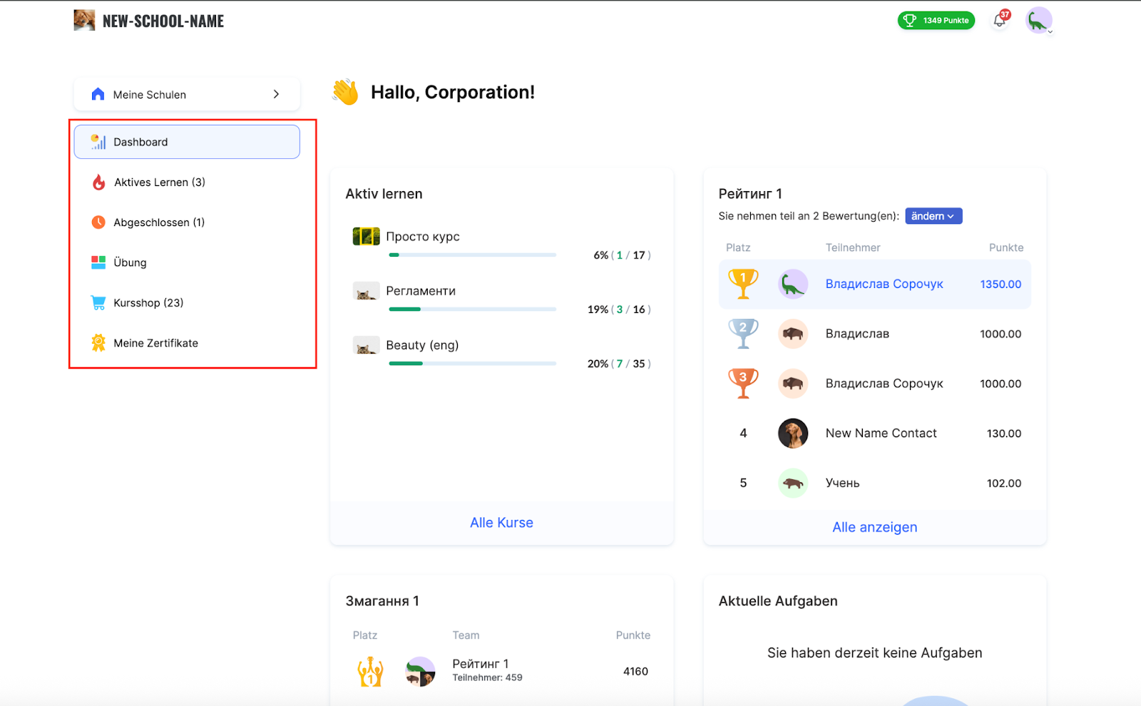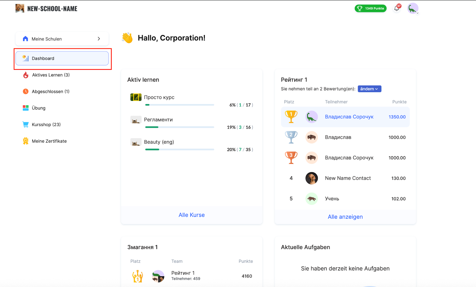 Status-Block – Zeigt das aktuelle Level oder den Rang des Teilnehmers im System an. Er erscheint nur, wenn die Gamification mit Statusstufen aktiviert ist, und kann in den entsprechenden Einstellungen komplett deaktiviert werden.