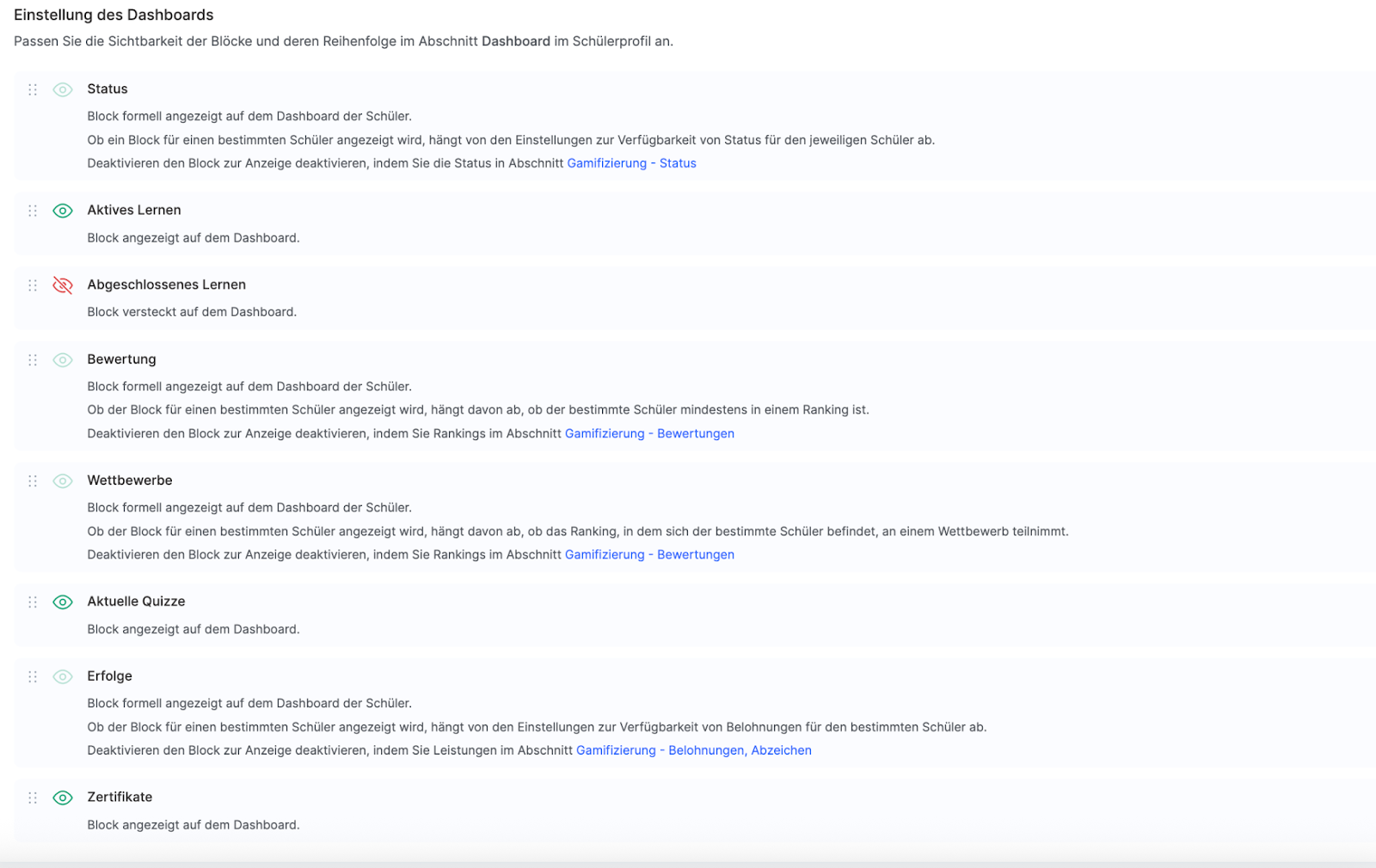 Administratoren können die Sichtbarkeit dieser Blöcke in Profileinstellungen → Dashboard-Bereich-Einstellungen über das Augen-Symbol steuern und ihre Reihenfolge per Drag & Drop anpassen.