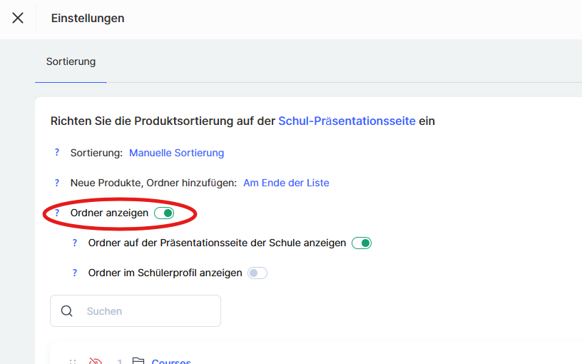Dort kannst du mit den entsprechenden Schaltern festlegen, ob die Ordner angezeigt werden sollen und ob sie auf der Präsentationsseite der Schule sichtbar sein sollen.