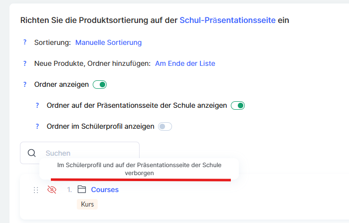 Wenn du mit der Maus über das Symbol fährst, erscheint ein Tooltip, der anzeigt, welche Ordner für die Schüler*innen sichtbar sind und welche ausgeblendet bleiben.