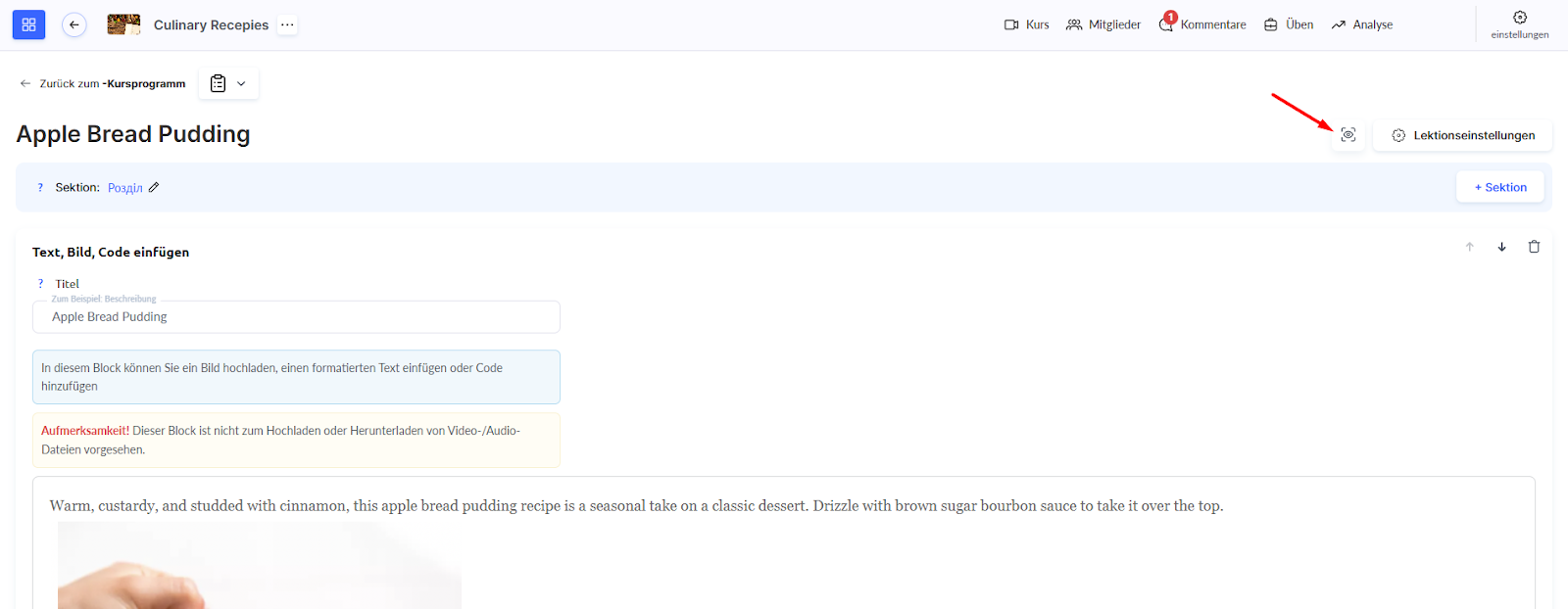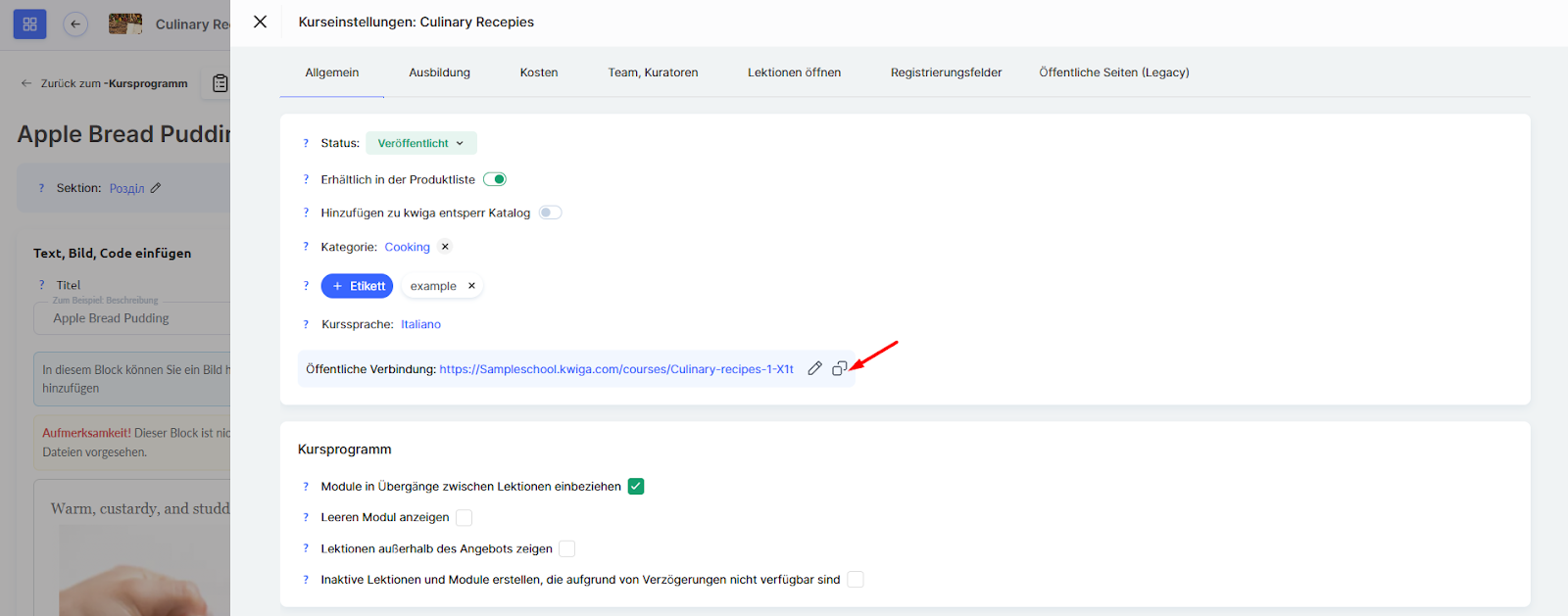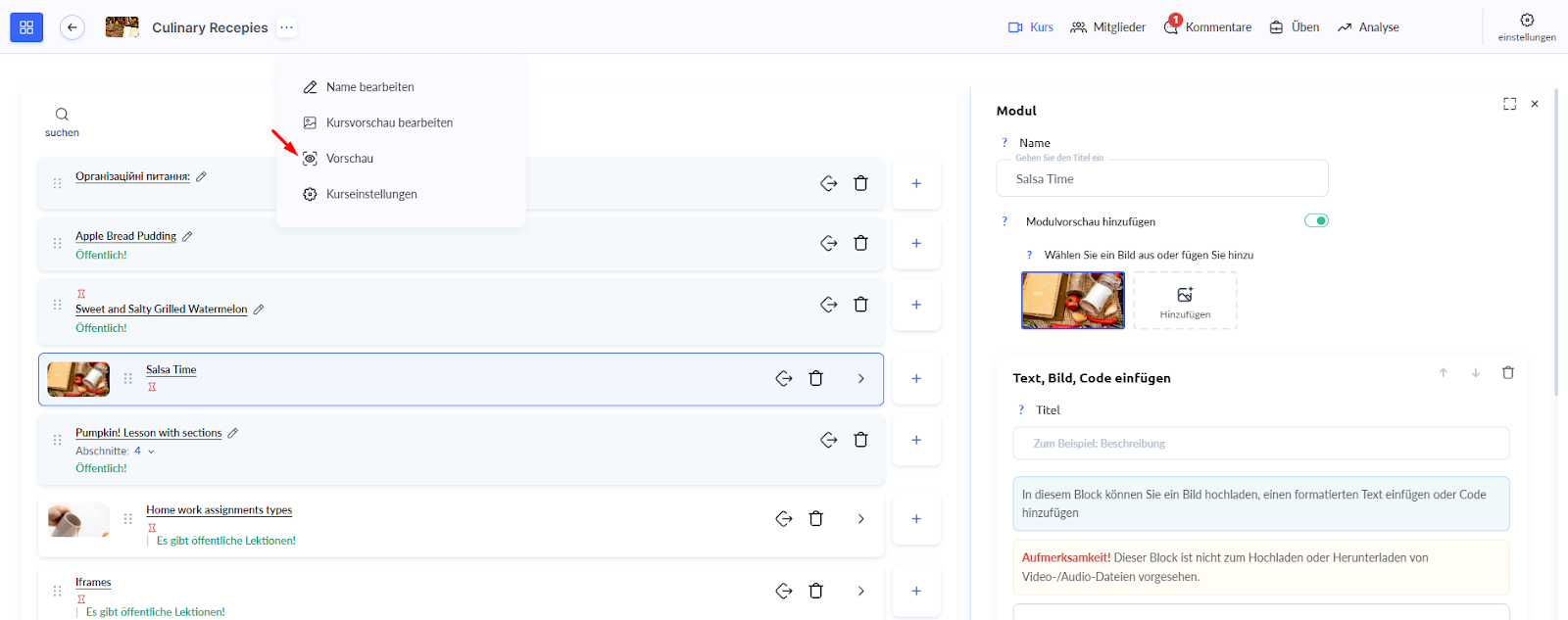 Wenn Sie außerdem den öffentlichen Link zum Kurs oder zu einer Lektion öffnen, während Sie in Ihrem Konto angemeldet sind, sehen Sie den Kurs (oder die Lektion) ebenfalls im Vorschaumodus.