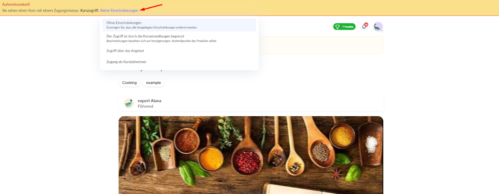 Zugriff durch Kurseinstellungen eingeschränkt – Sie sehen den Kurs mit allen Verzögerungen bei der Freigabe von Lektionen und Modulen sowie mit allen Checkpoints. Einige Lektionen können in der Vorschau nicht verfügbar sein. Dieser Modus ist ideal, um den Freigabeplan der Lektionen zu testen.