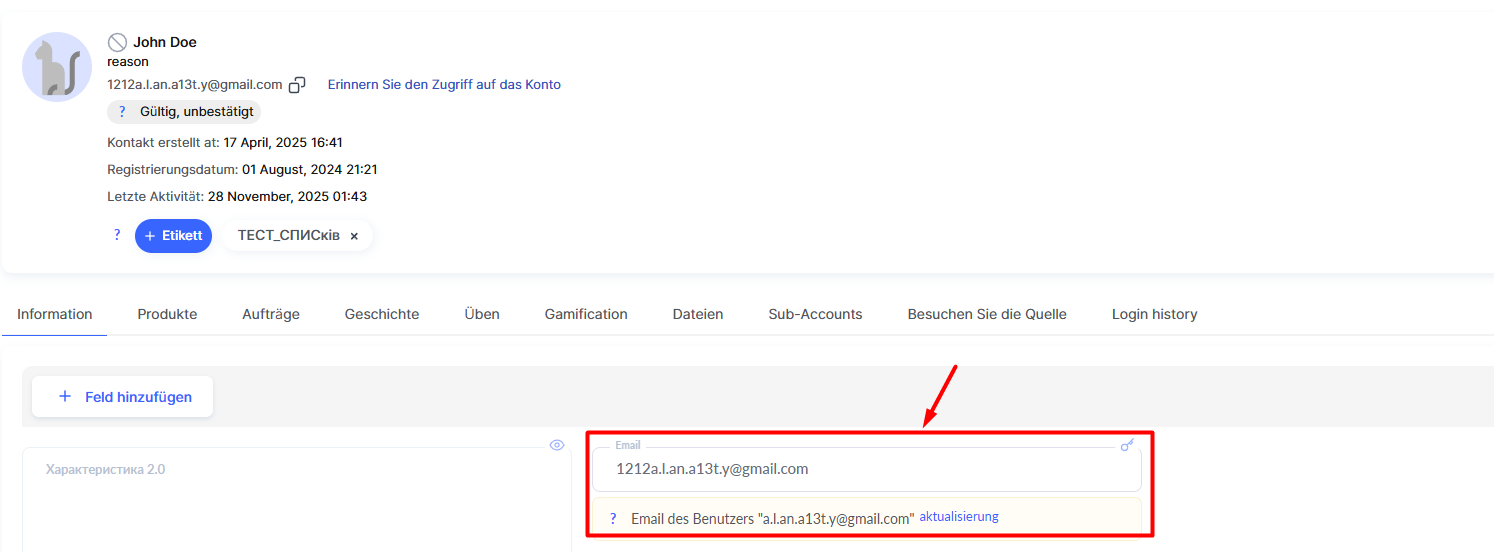 Prüfe, ob in der Kontaktkarte eine Meldung erscheint, dass die E-Mail des Nutzers abweicht (siehe Screenshot).