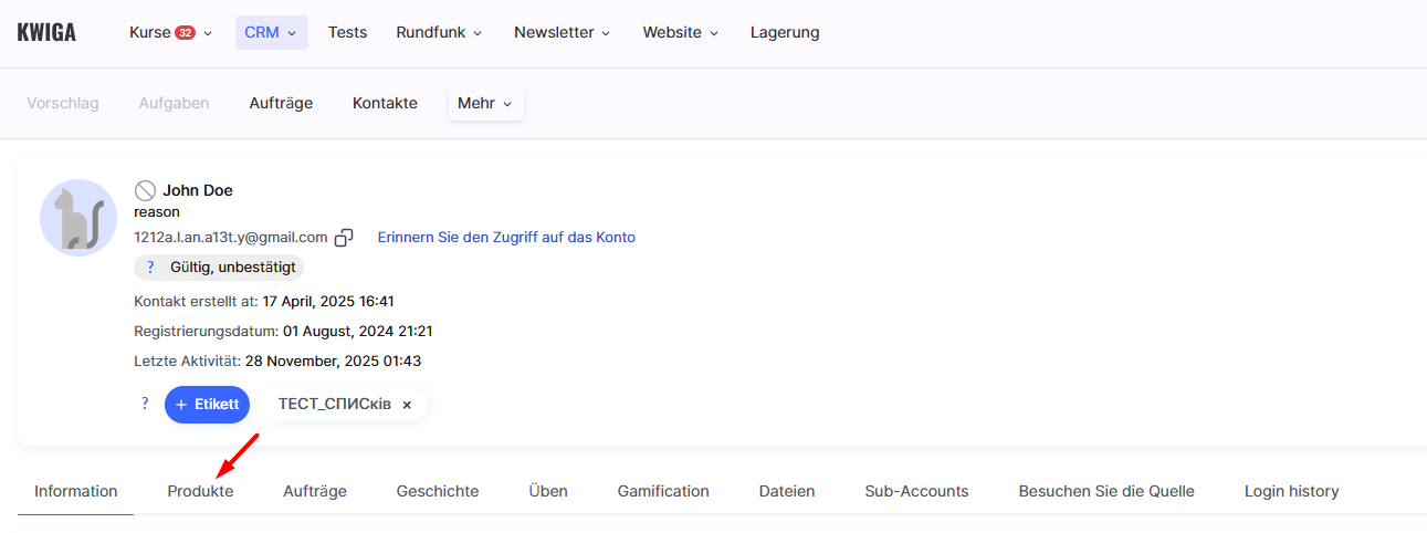 Schritt 3: Gehe in der Kontaktkarte zum Reiter Produkte.