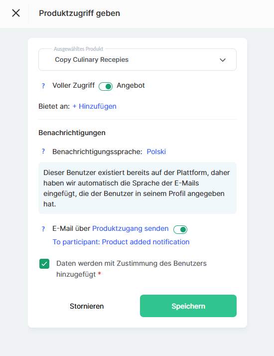 Klicke auf +Produkt und wähle das benötigte Produkt aus (Kurs, Marathon oder geschlossene Gruppe).