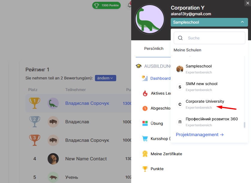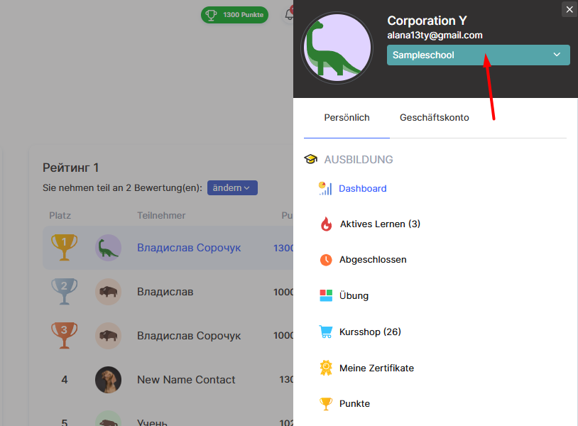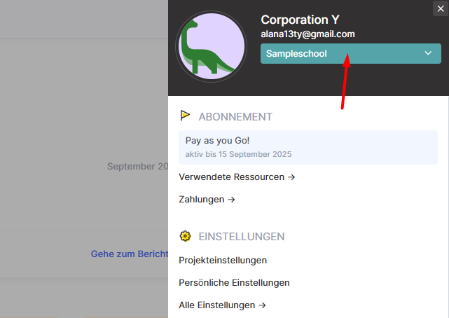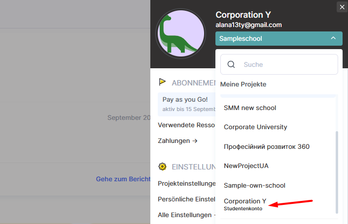Klicke auf den Kontonamen (wie im Bild gezeigt), um automatisch in das Studenten-Konto zu wechseln.