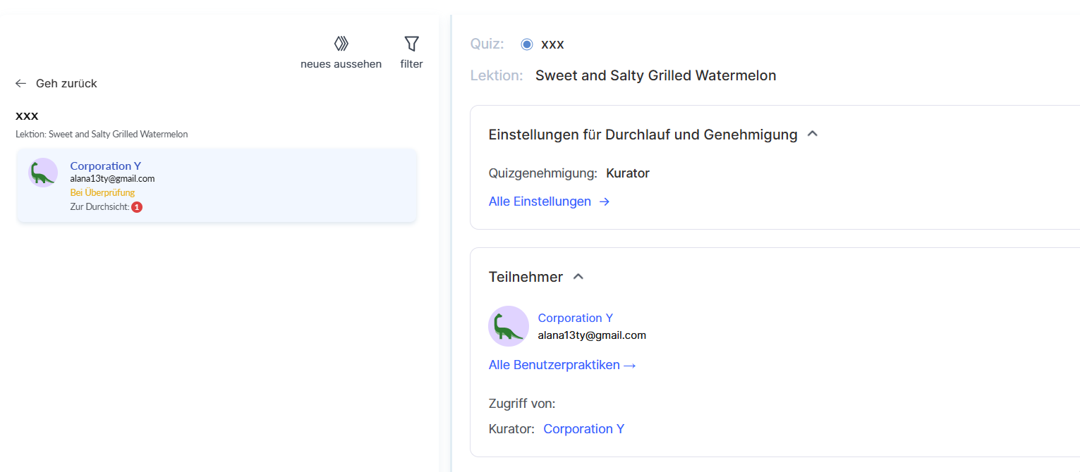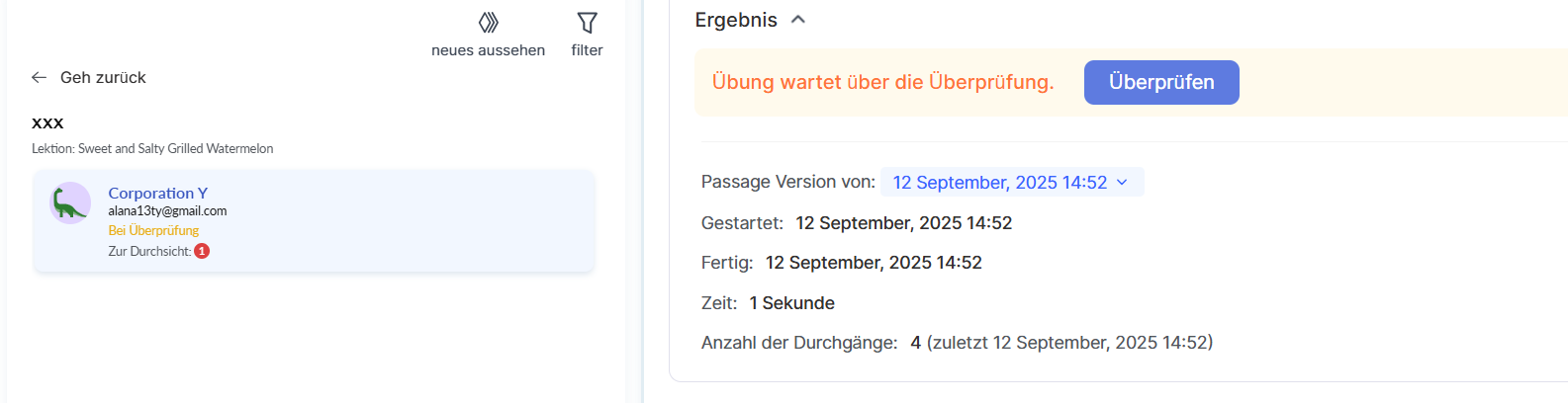 Wählen Sie die gewünschte Lektion, wählen Sie die/den Studierende*n aus und überprüfen Sie die Antworten.