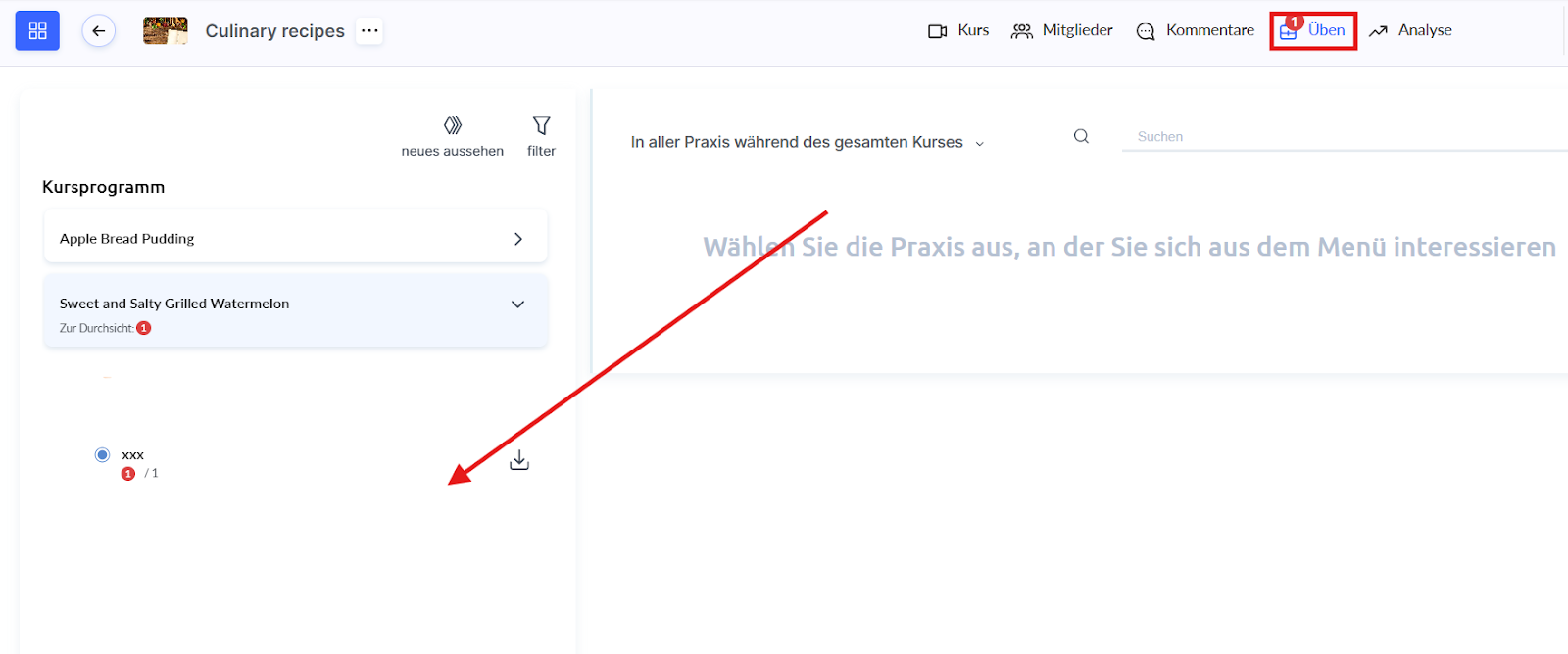 Um alle Testversuche anzuzeigen, gehen Sie im Kurs auf die Registerkarte Übung. Diese Registerkarte ist auf der Kursseite verfügbar — klicken Sie einfach auf das entsprechende Symbol.