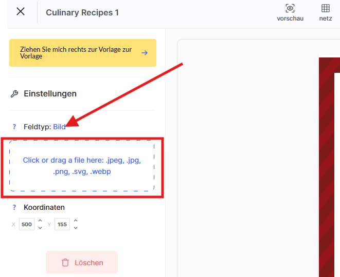 Laden Sie das gewünschte Bild im Format .jpeg, .jpg, .png oder .svg hoch und passen Sie dessen Größe an.