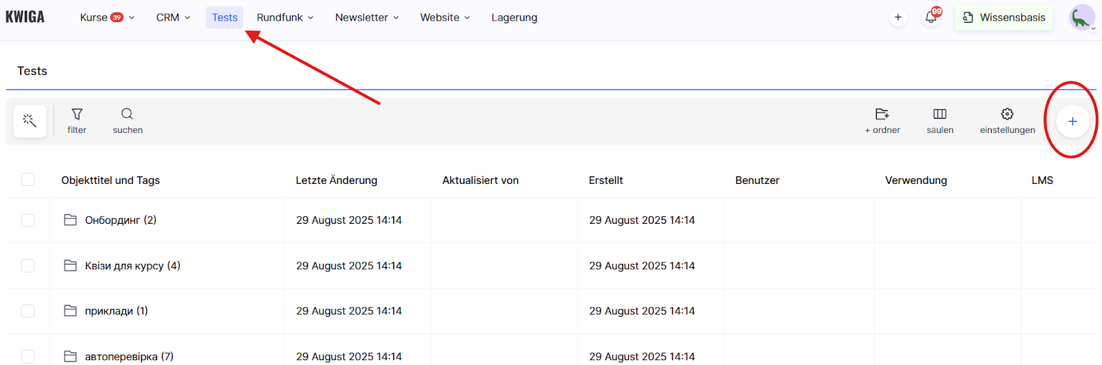 Das Erstellen eines Tests ist sehr einfach – gehen Sie einfach ins Quizzes-Menü, klicken Sie auf +Quiz, fügen Sie Fragen hinzu und konfigurieren Sie die Einstellungen.