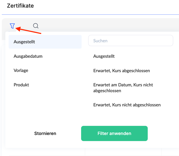 Der Zertifikate-Bericht ist ein praktisches Tool zur Kontrolle der auf der Plattform ausgestellten Zertifikate. Mithilfe von Filtern und der Suchfunktion können Sie die Zertifikatshistorie eines bestimmten Teilnehmers einfach einsehen oder alle Dokumente zu einem bestimmten Kurs finden.