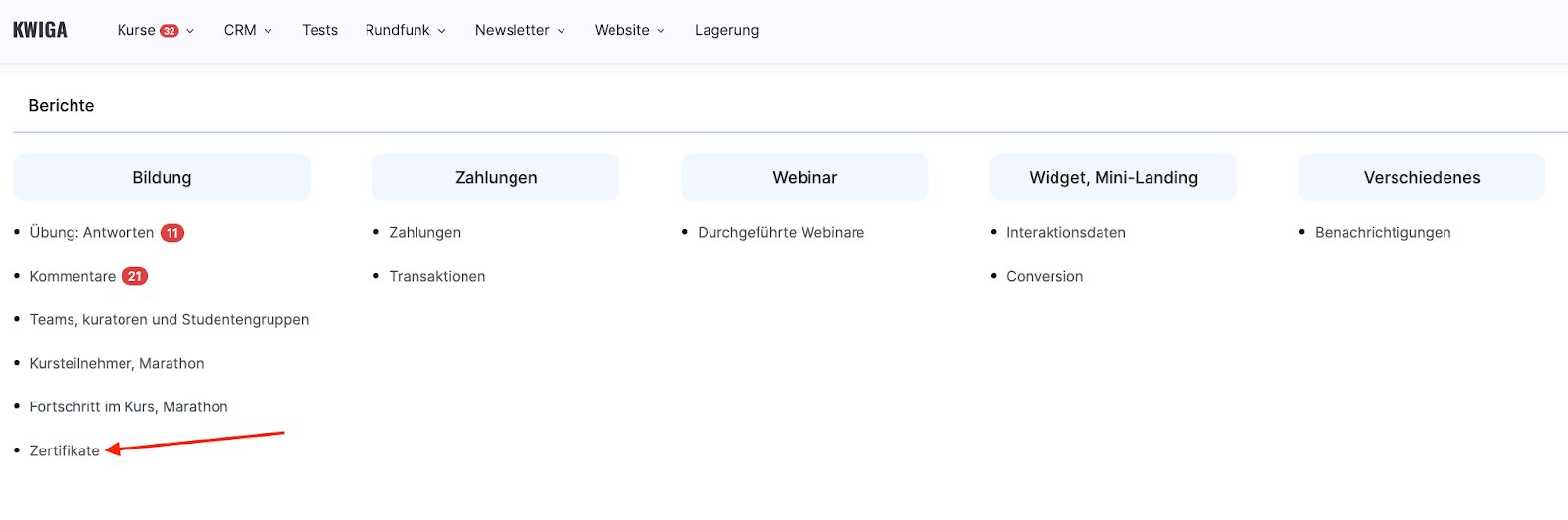 Um den Zertifikate-Bericht zu öffnen, gehen Sie zu Kurse → Alle Berichte