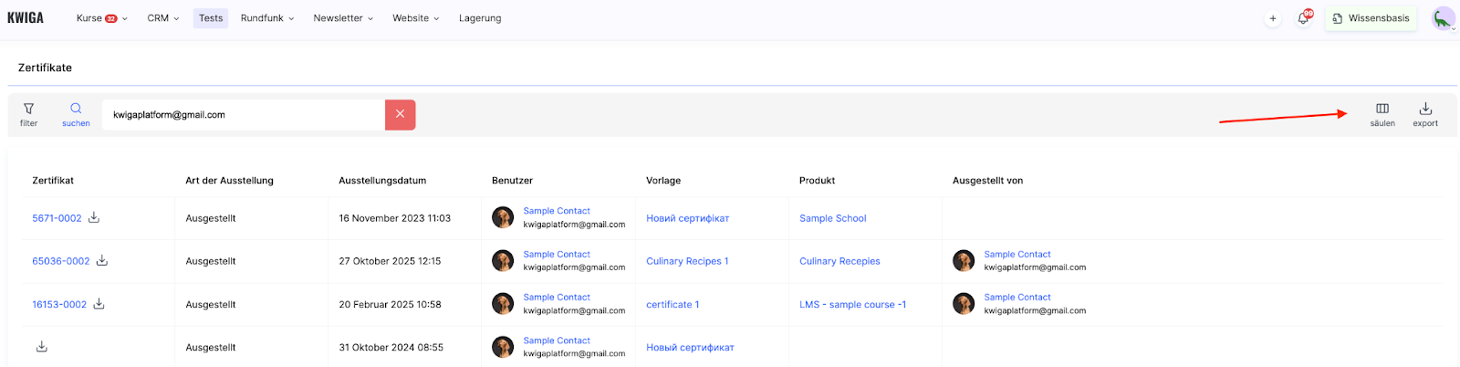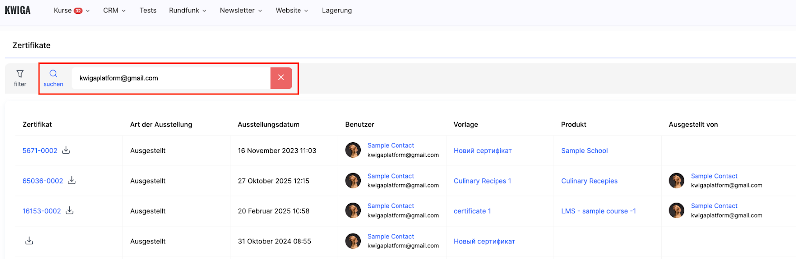 Geben Sie einfach den Namen des Teilnehmers oder seine E-Mail-Adresse in das Suchfeld ein, und das System filtert die Ergebnisse und zeigt alle Zertifikate an, die dieser Benutzer erhalten hat. Dies ist praktisch, um die Zertifikatshistorie eines einzelnen Teilnehmers zu überprüfen oder Berichte über seine Leistungen zu erstellen.