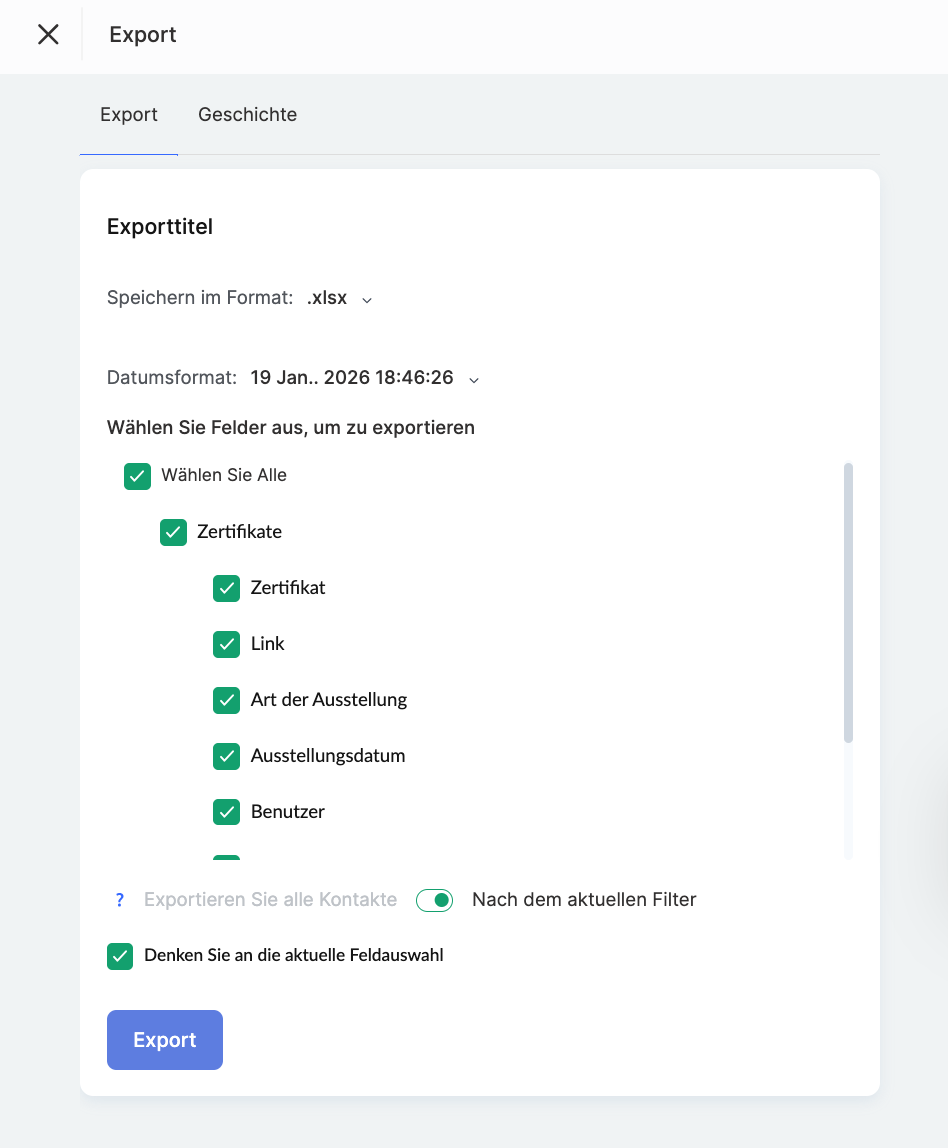 Export — Möglichkeit, Zertifikatsdaten in eine externe Datei zu exportieren, um sie weiterzuverarbeiten oder zu archivieren.