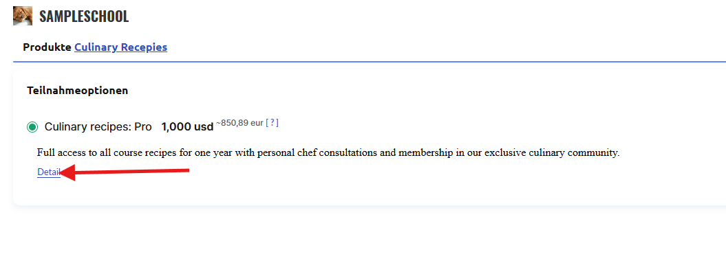 Wenn Sie ein Rabattangebot erstellt haben, sehen die Teilnehmer den reduzierten Preis fett hervorgehoben, wobei der vorherige Preis daneben durchgestrichen angezeigt wird. Dadurch wird der Vorteil eines Kaufs zum aktuellen Zeitpunkt visuell betont.