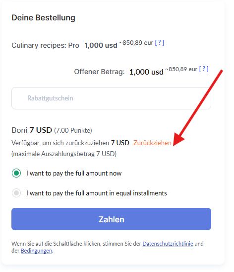 Wenn die Option zur Bezahlung mit Punkten aktiviert ist, sehen die Teilnehmer die Möglichkeit, ihre gesammelten Bonuspunkte zu verwenden, um die Kosten ihres Kaufs zu reduzieren.