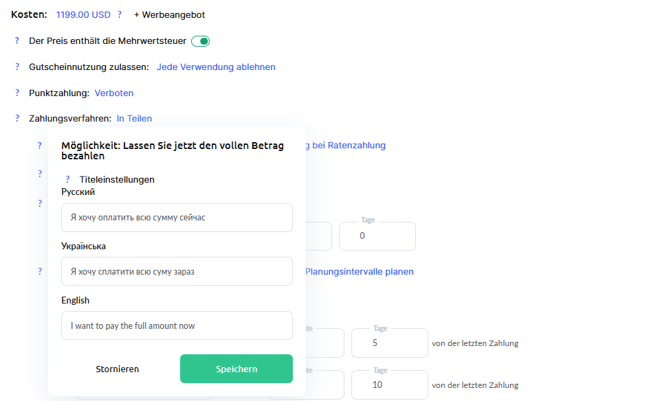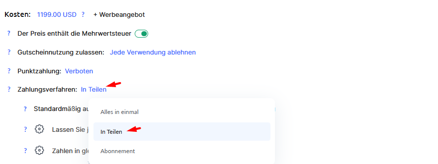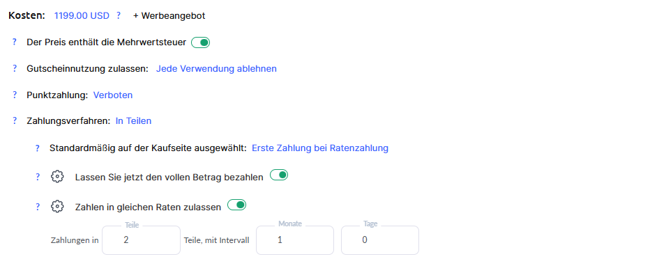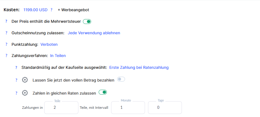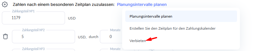 Gleichmäßige Ratenzahlungen erlauben – Eine Schnelleinstellung, mit der der Betrag in mehrere Teile aufgeteilt wird. Sie können die Anzahl der Teile und die Intervalle festlegen. Die maximale Anzahl der Raten beträgt 36. Die Intervalle werden ab der ersten Zahlung gezählt. Kunden können einzelne Raten (oder mehrere) vorzeitig bezahlen.