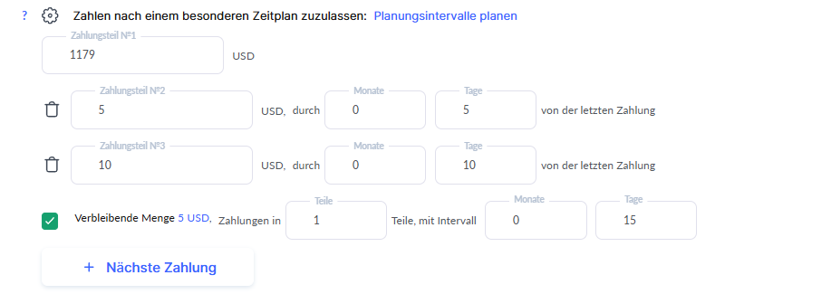 Zahlungsintervalle planen – Ermöglicht es, für jede Rate unterschiedliche Beträge und Zeiträume festzulegen. So können Sie individuelle Zahlungspläne erstellen, bei denen jede Teilzahlung einen anderen Betrag und unterschiedliche Zeitabstände haben kann.
