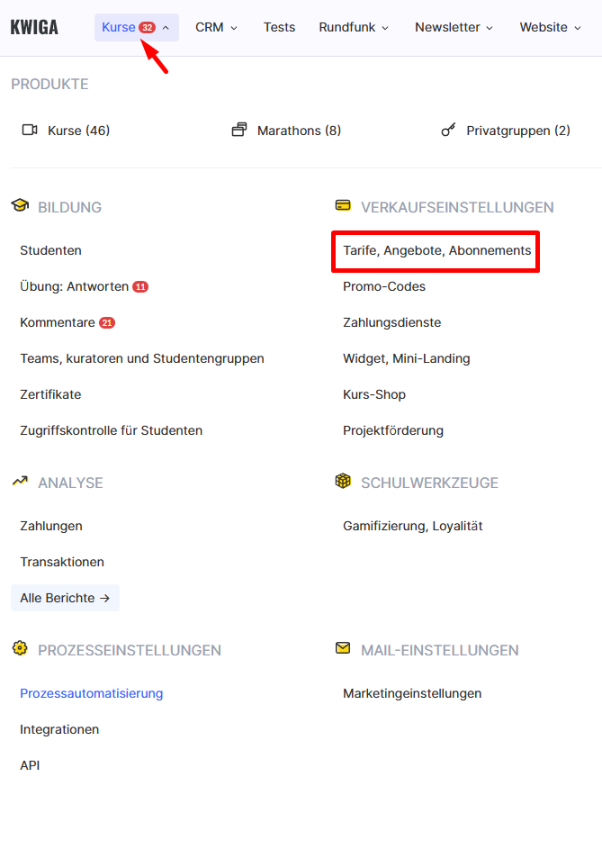 Um ein Aktionsangebot zu erstellen, gehen Sie zu Kurse – Tarife, Angebote, Abonnements.